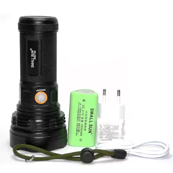 چراغ قوه پلیسی Small Sun T183 کابل شارژ Micro USB آداپتور 5 ولت 1 میلی آمپر 1 عدد پک باتری لیتیوم یون 7800 میلی آمپر کیف